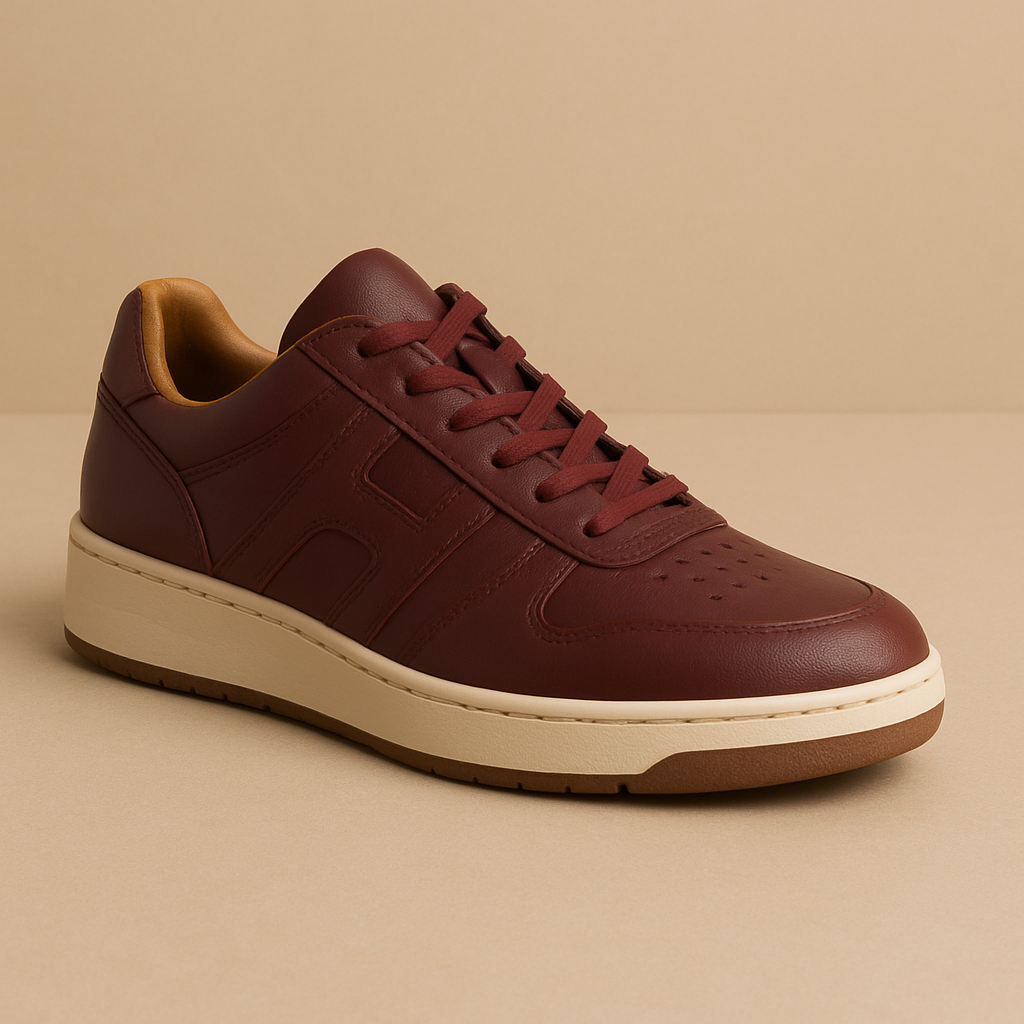 Ces baskets basses pour homme se distinguent par leur cuir lisse bordeaux et leurs finitions soignées. Le logo en relief sur le côté et la semelle contrastante beige apportent un style affirmé et moderne. Parfaites pour dynamiser vos tenues urbaines.