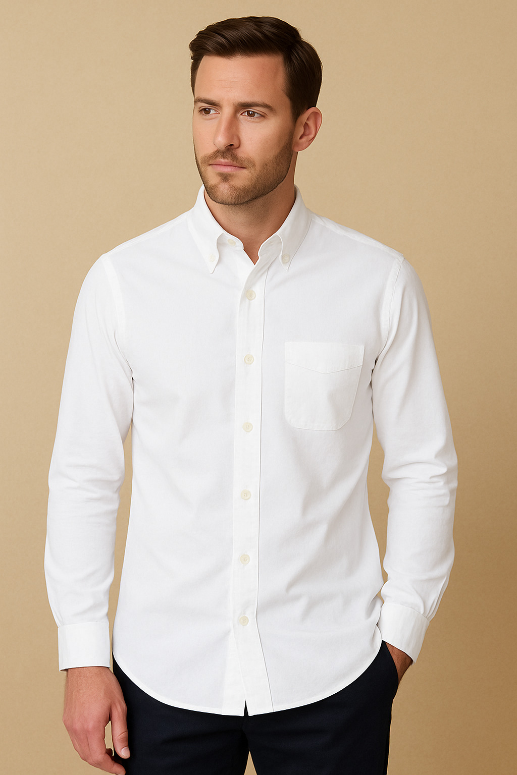 Chemise pour homme en coton blanc, coupe ajustée, col classique et boutons nacrés. Sa confection impeccable et son tissu doux lui confèrent un style intemporel adapté à toutes les occasions, du travail aux cérémonies.