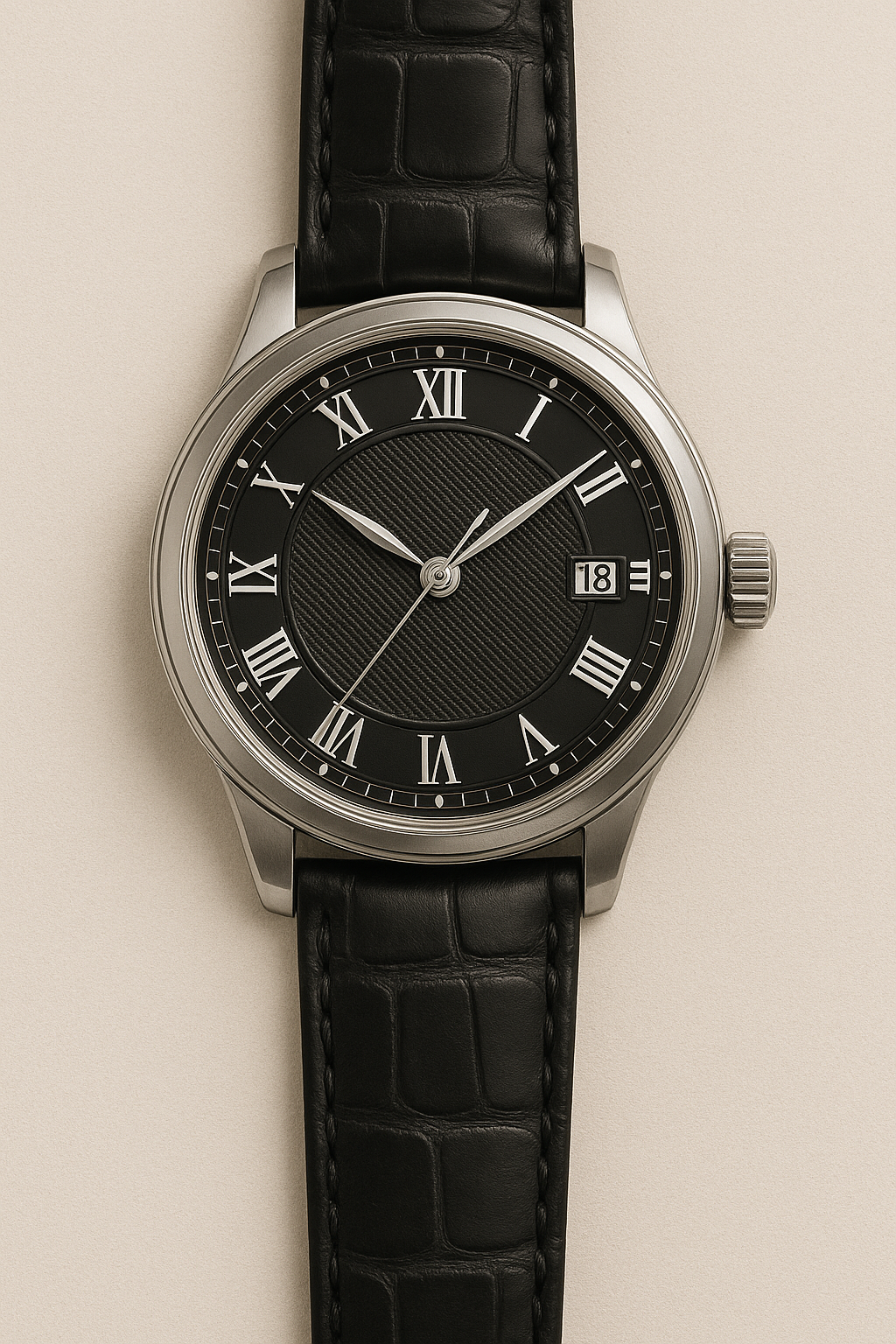 Alliant élégance intemporelle et précision, cette montre pour homme se distingue par son cadran noir guilloché, ses chiffres romains blancs et son boîtier en acier inoxydable poli. Son bracelet en cuir noir à motif alligator apporte confort et raffinement.